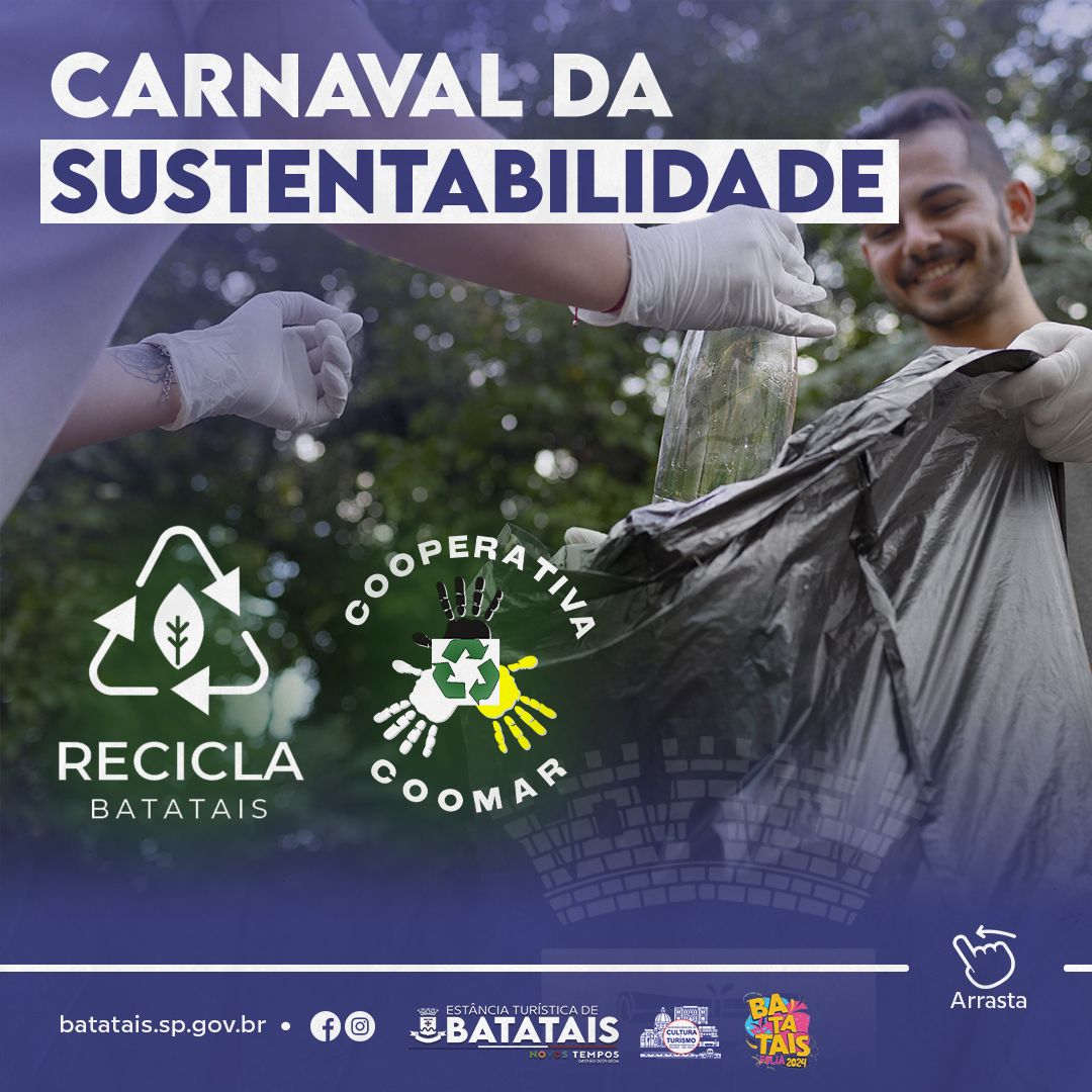A Prefeitura de Batatais, por meio da Secretaria Municipal de Cultura e Turismo, estará no Carnaval Batatais Folia 2024 trabalhando com a COOMAR, uma das cooperativas de catadores da cidade, na coleta de recicláveis em todos os eventos e, também, na prestação de serviços de limpeza.