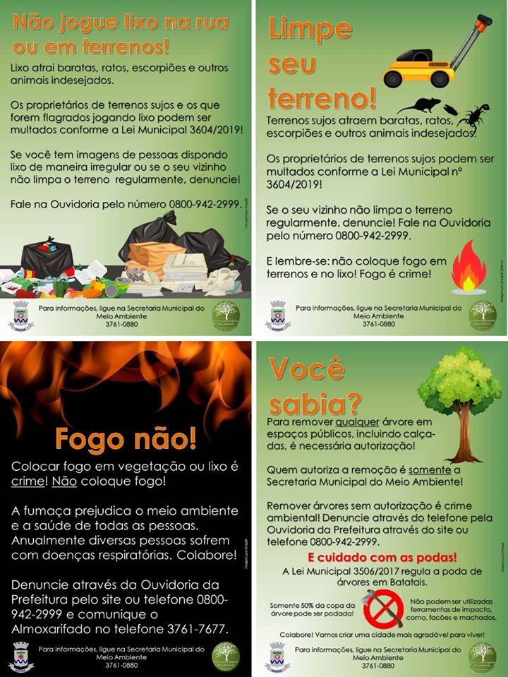 Nos últimos anos a Secretaria Municipal do Meio Ambiente tem intensificado suas ações informativas, principalmente através de mídias digitais, com temas variados como fogo, lixo, poluição, desperdício de água e outros assuntos muito discutidos. Apesar de estudos indicarem que cada vez mais as pessoas acessam conteúdos digitais, ainda há parte da população que nem sequer tem acesso a aparelhos de telefones. Surgiu então a ideia de aumentar a abrangência das campanhas realizadas através da distribuição de cartazes informativos sobre alguns temas específicos, por diversos pontos do Município. Uma temática recorrente na Secretaria é a remoção de árvores nos passeios públicos; muitas pessoas ligam para a Secretaria inclusive querendo remover árvores de locais públicos administrados pelo órgão, como Praças e Parques. Um assunto que tem aparecido bastante, principalmente desde o início da Fiscalização Ambiental, diz respeito à limpeza de terrenos com mato alto e/ou com entulho e lixo. O lixo, inclusive, é tema de outro cartaz pois também é sempre um assunto tratado pela Secretaria, assim como o fogo, o assunto do último dos quatro cartazes, principalmente no período de seca em que estamos. Todos os cartazes são atemporais, podendo ser utilizados ao longo de todo o ano em campanhas. A Secretaria Municipal do Meio Ambiente pretende afixar estes cartazes em prédios e locais públicos de grande circulação ou em prédios particulares, desde que autorizados por seus responsáveis. Vale ressaltar que esta distribuição será feita tão breve seja possível, em função da pandemia, seguindo as normas de segurança. As campanhas digitais continuarão, fortalecidas por esta campanha impressa, na busca por um meio ambiente equilibrado de modo a dar boa qualidade de vida aos cidadãos. Você pode nos ajudar nisso: compartilhe os conteúdos digitais da Secretaria Municipal do Meio Ambiente, curta nossas publicações se gostar e converse com seu colega ou em casa sobre os conteúdos que tem visto. Ajude você também essa causa. Juntos somos mais fortes!