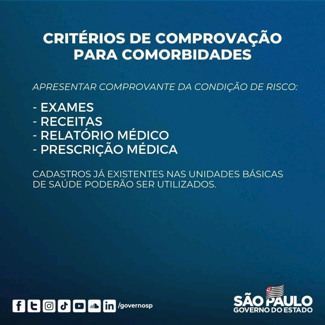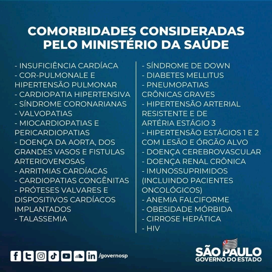 COMORBIDADES CONSIDERADAS PELO MINISTÉRIO DA SAÚDE:- Insuficiência cardíaca;- Cor-pulmonale e hipertensão pulmonar;- Cardiopatia hipertensiva;- Síndromes coronarianas;- Valvopatias;- Miocardiopatias e pericardiopatias;- Doença da aorta, dos grandes vasos e fístulas arteriovenosas;- Arritmias cardíacas;- Cardiopatias congênitas;- Próteses valvares e dispositivos cardíacos implantados;- Talassemia;- Síndrome de Down;- Diabetes mellitus;- Pneumopatias crônicas graves;- Hipertensão arterial resistente e de artéria estágio 3;- Hipertensão estágios 1 e 2 com lesão em órgão alvo;- Doença cerebrovascular;- Doença renal crônica;- Imunossuprimidos (incluindo pacientes oncológicos/câncer);- Anemia falciforme;- Obesidade mórbida;- Cirrose hepática;- HIV.