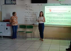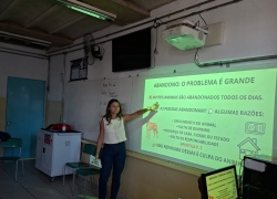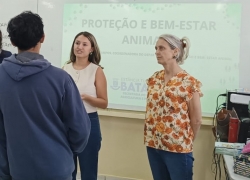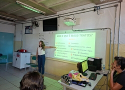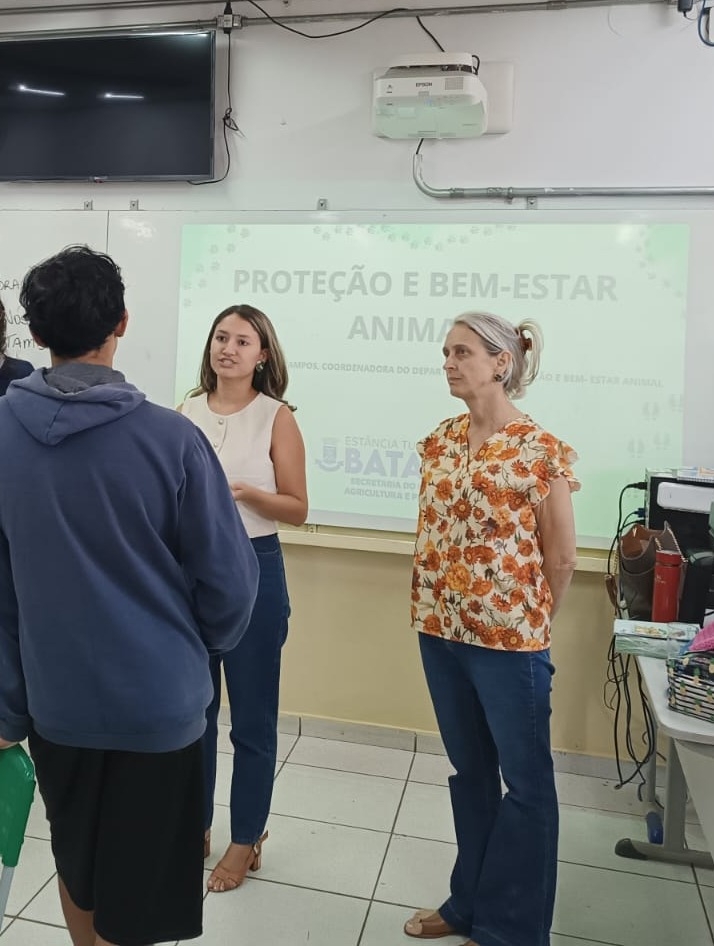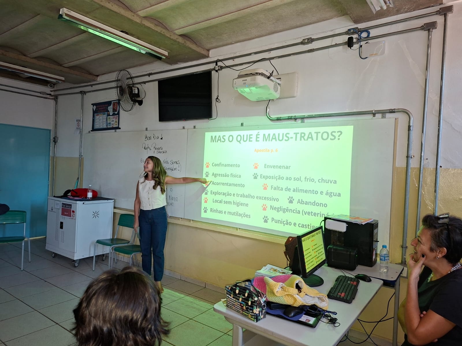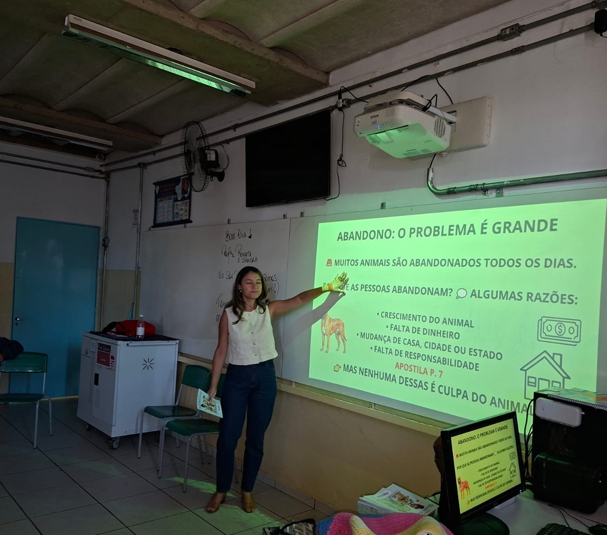 Dando continuidade às ações educativas, a Secretaria também realizou uma palestra na Escola Estadual Silvio de Almeida, abordando temas como Proteção e Bem-Estar Animal, Guarda Responsável e Animais Silvestres. A atividade foi conduzida por Júlia Rodrigues Campos, coordenadora do Departamento de Proteção e Bem-Estar Animal, que destacou a importância da educação como ferramenta essencial para a construção de uma convivência mais harmoniosa entre a população e os animais.