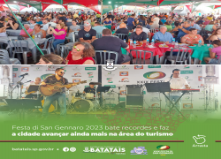 A Administração Municipal, por meio da Secretaria de Cultura e Turismo, comemora os resultados excepcionais da 29ª Festa de San Gennaro de Batatais. Realizado ao longo de dois finais de semana, de 6 a 10 e de 15 a 17 de setembro, o evento superou todas as expectativas em termos de público, arrecadação e promoção da cidade enquanto Estância Turística do Estado de São Paulo.