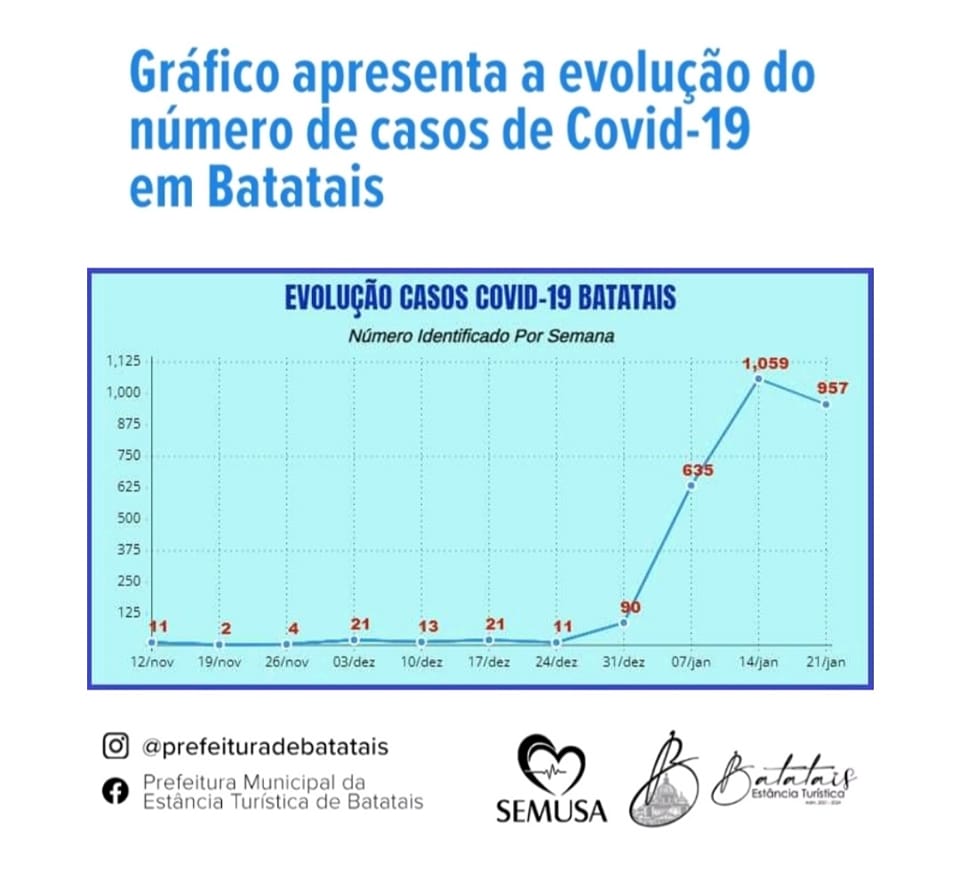 O município já soma 2651 registros novos de Covid-19 apenas neste início do ano (635 na 1ª semana, 1.059 na 2ª semana e 957 na 3ª semana).