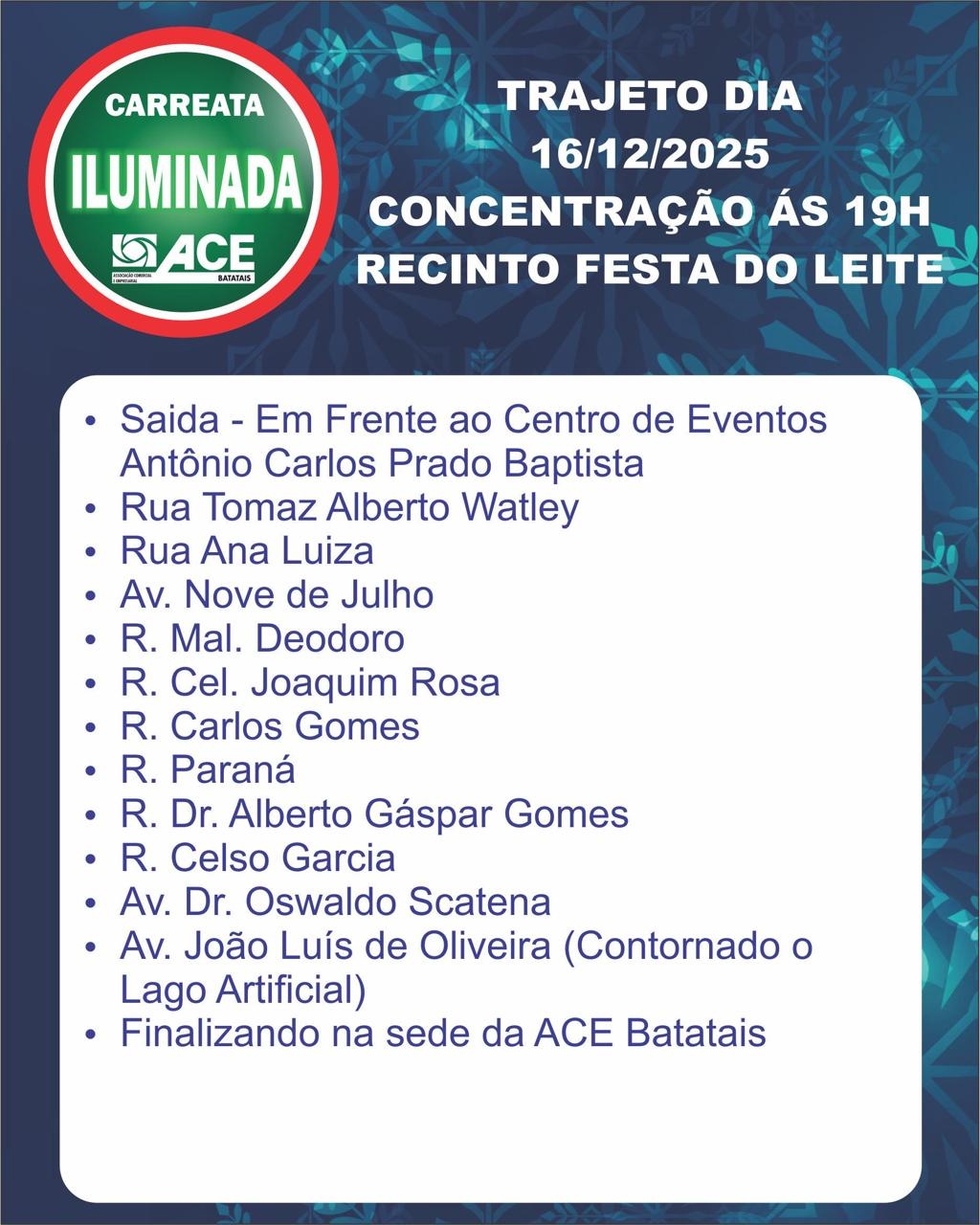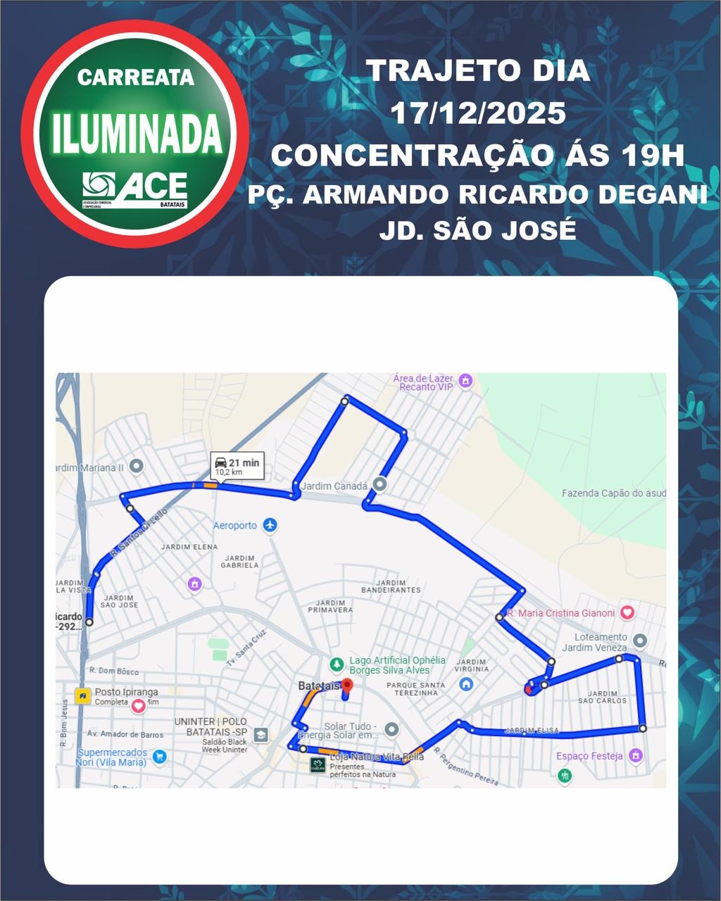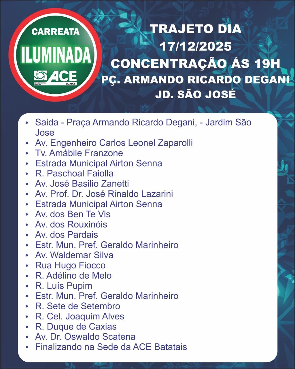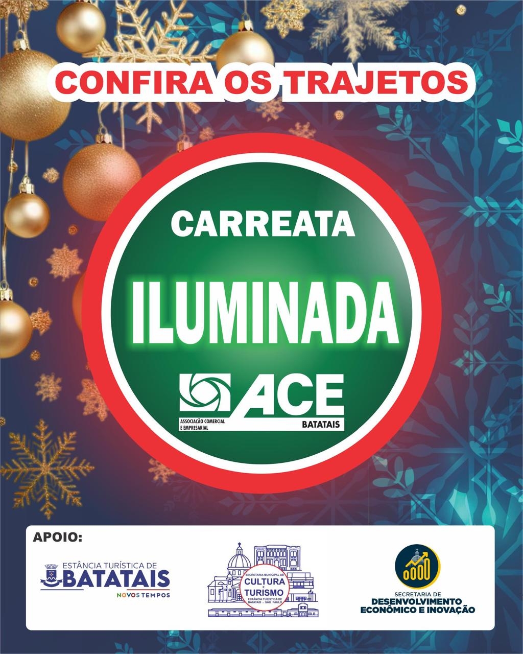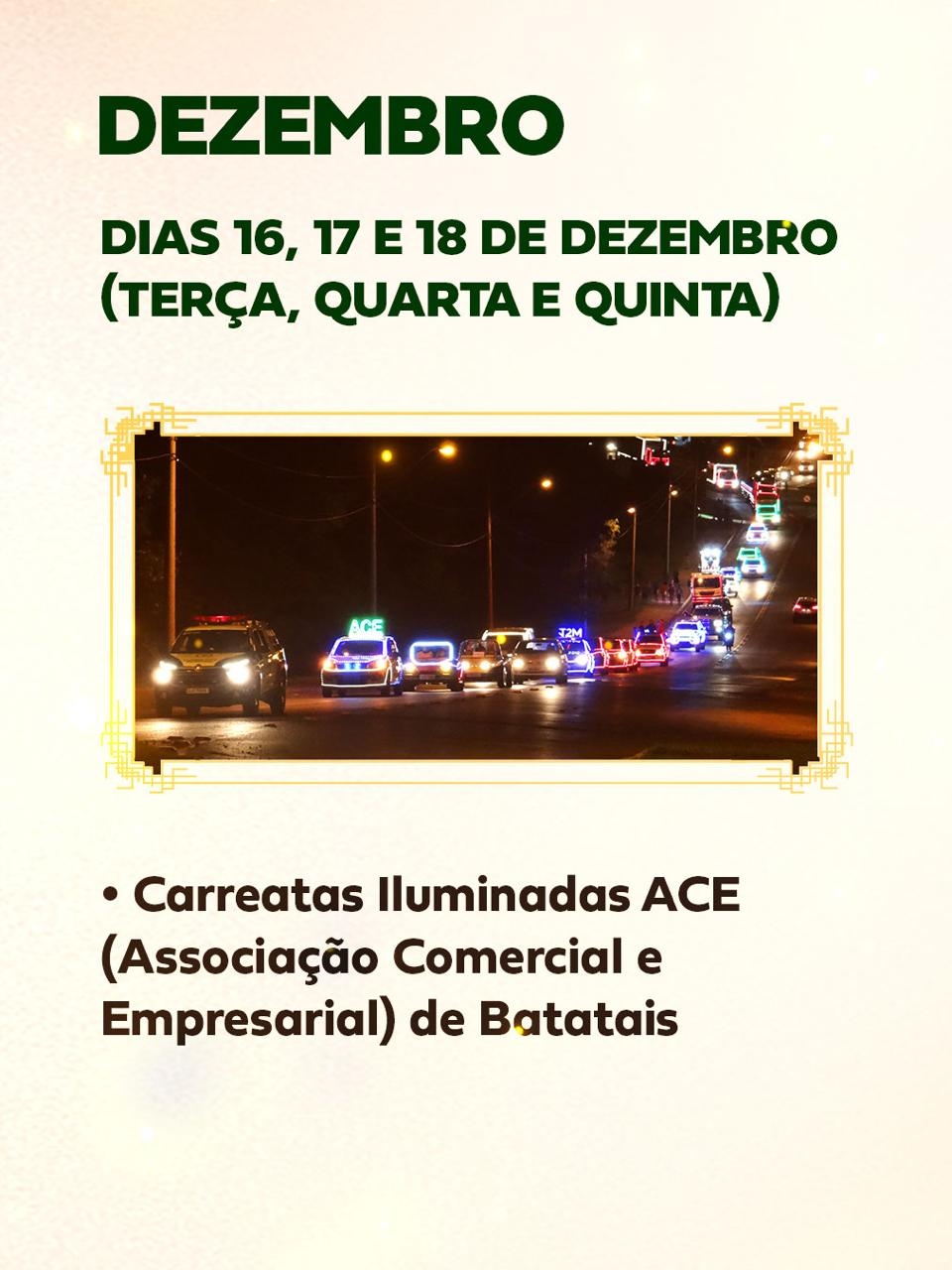O próximo destaque do calendário natalino são as Carreatas Iluminadas, organizadas pela ACE (Associação Comercial e Empresarial) de Batatais com o apoio da Prefeitura, que acontecem nos dias 16, 17 e 18 de dezembro, levando o clima do Natal a diferentes bairros da cidade.