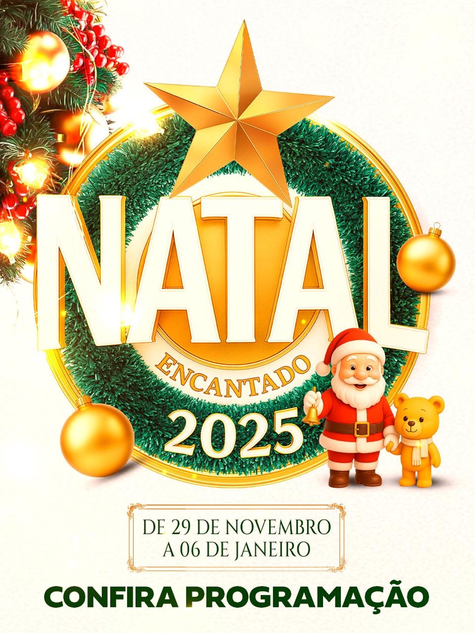 A programação do Natal Encantado 2025 segue ao longo do mês com apresentações culturais, concursos, feiras, shows e, no dia 23 de dezembro, a tradicional Parada de Natal, no entorno do Lago Artificial, um dos momentos mais aguardados das celebrações.
