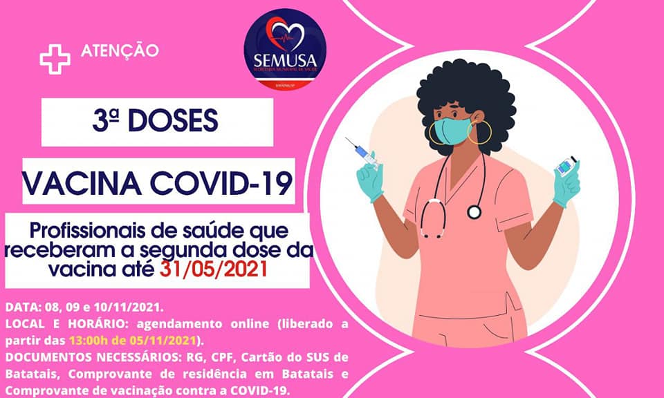 Terceiras doses (DOSE ADICIONAL) de profissionais de saúde que receberam a segunda dose da vacina contra a COVID-19 até 31/05/2021; DOCUMENTAÇÃO OBRIGATÓRIA: