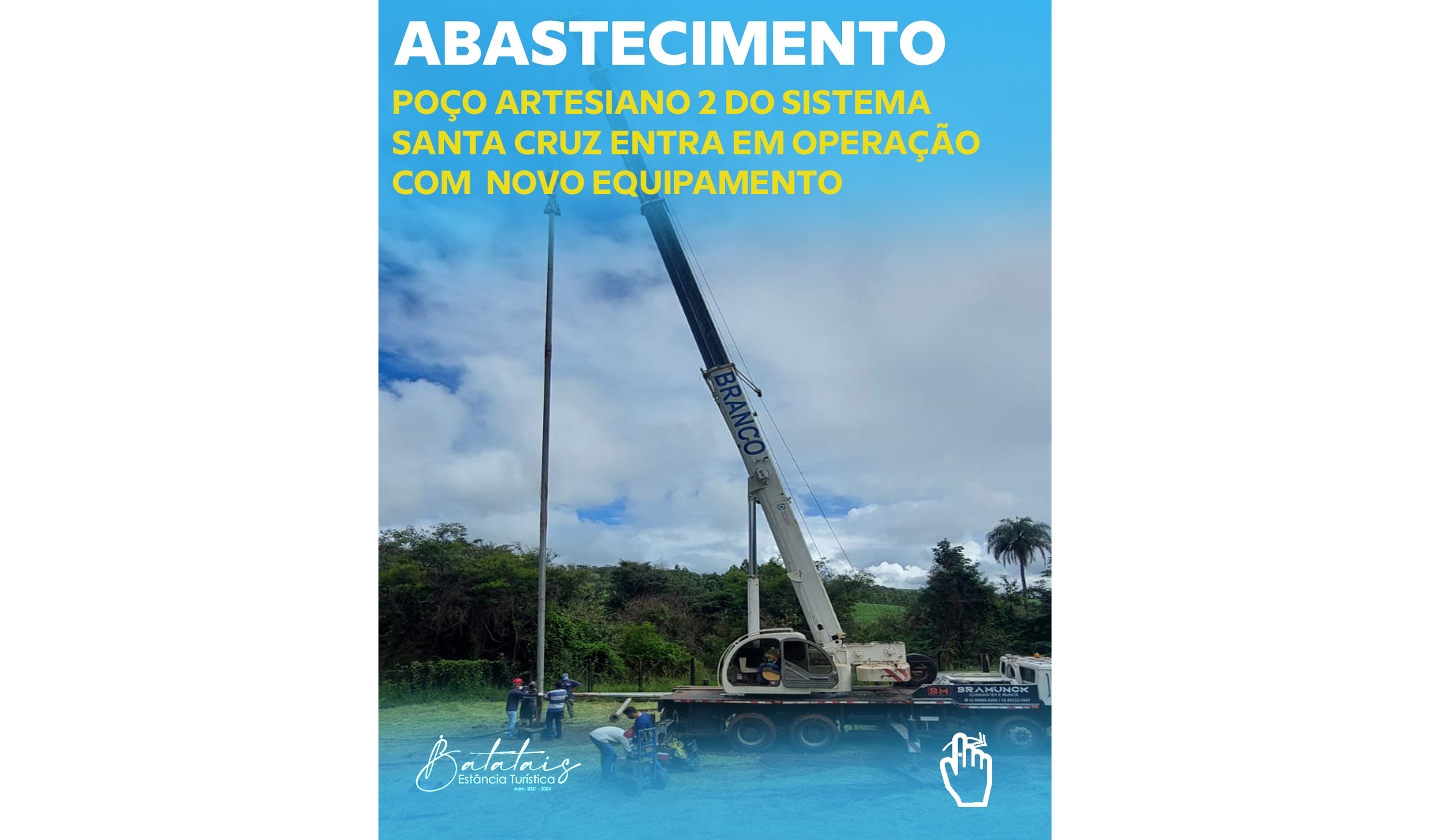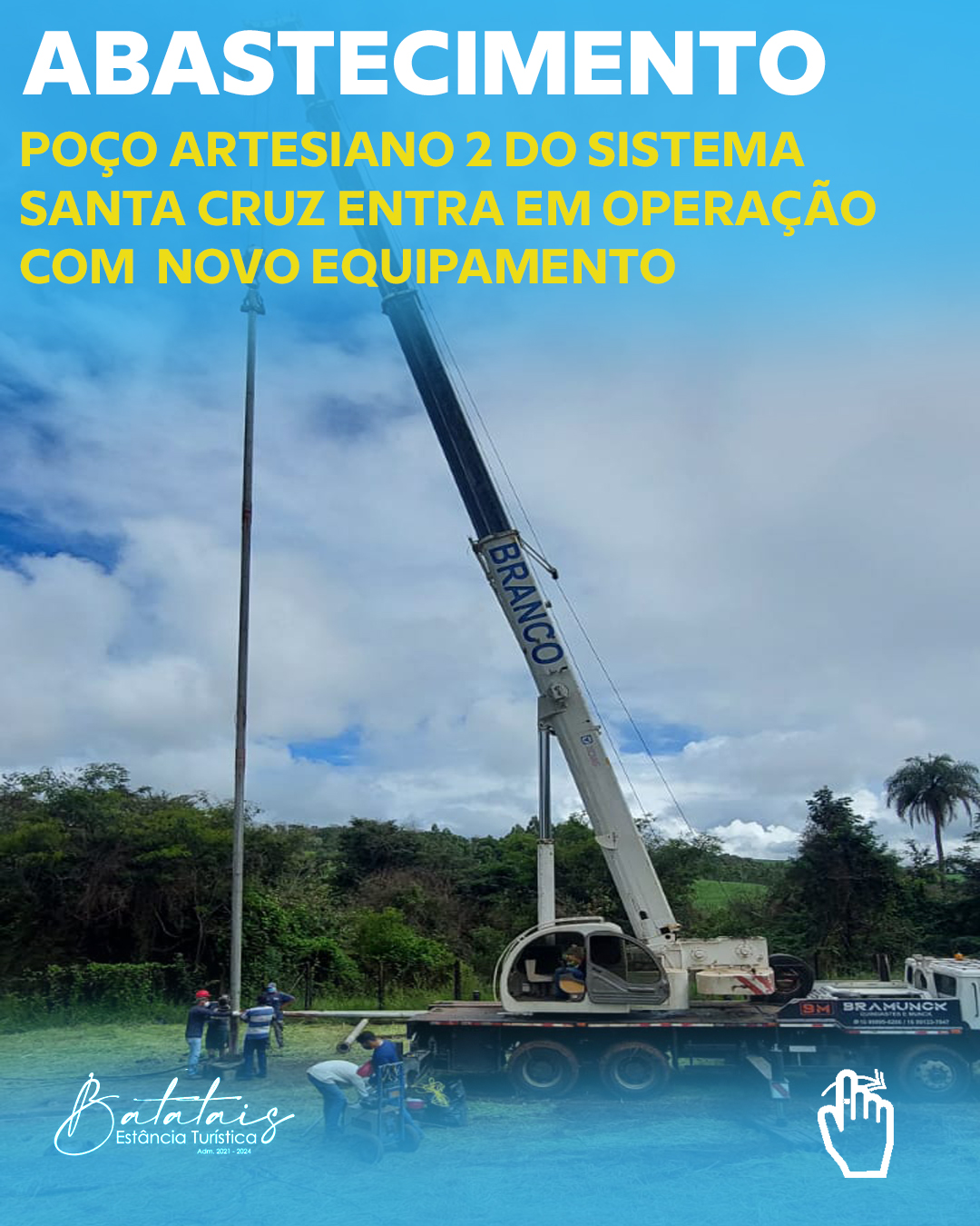 A Prefeitura de Batatais, por meio da Secretaria de Obras, Planejamento e Serviços Públicos, informa que terminou no início da noite desta terça-feira, 8 de fevereiro, a operação de troca da bomba do poço 2, do Sistema Santa Cruz, localizado às margens da Vicinal Geraldo Marinheiro.