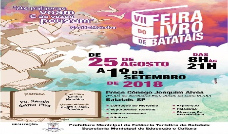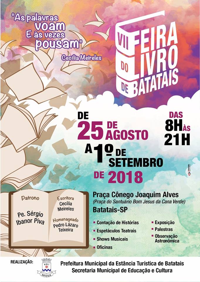 A Prefeitura de Batatais, por meio da Secretaria Municipal de Educação e Cultura, realizará, entre os dias 25 de agosto e 1º de setembro, a VII edição da Feira do Livro. O evento que concentrará a maior parte das atividades na Praça Cônego Joaquim Alves, a Praça do Santuário do Bom Jesus da Cana Verde, contará com contação de histórias, shows musicais, apresentações teatrais, oficinas, palestras, exposições e observações astronômicas.