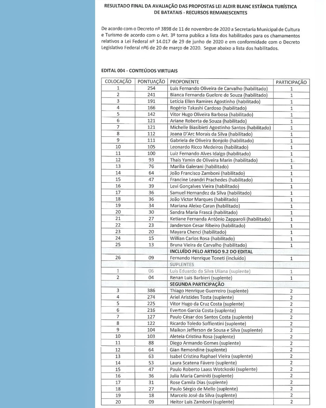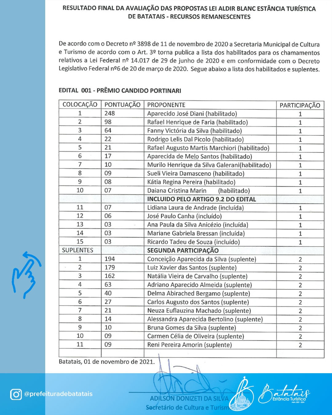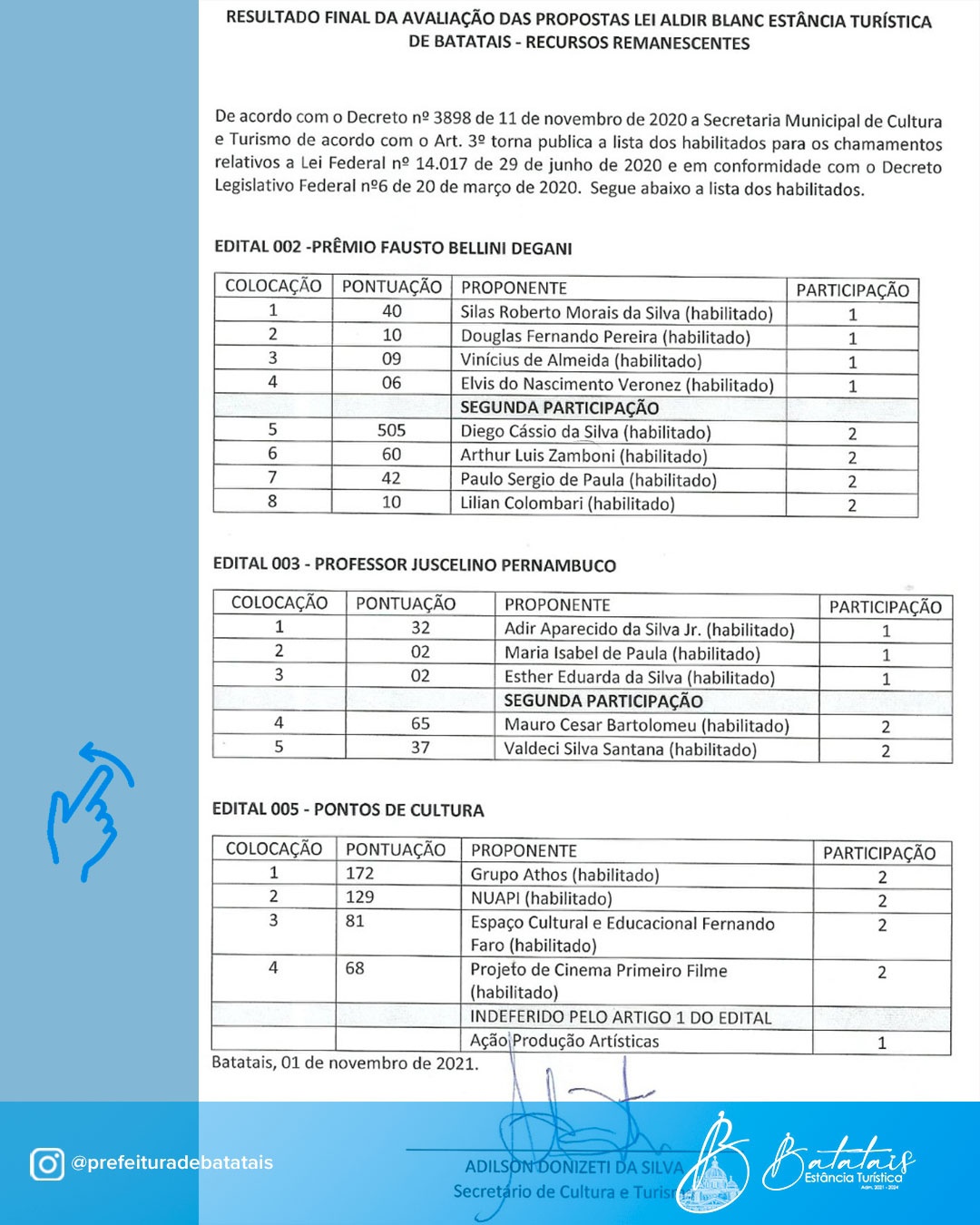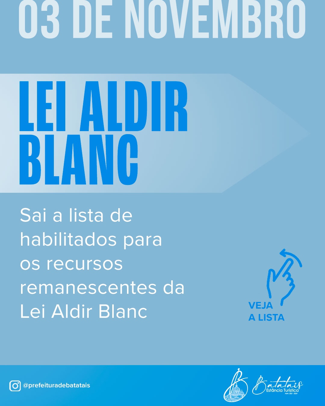 A Prefeitura de Batatais, por meio do Departamento de Cultura, informa que no dia 1º de novembro saiu à lista de habilitados nos editais da Lei Aldir Blanc na cidade.